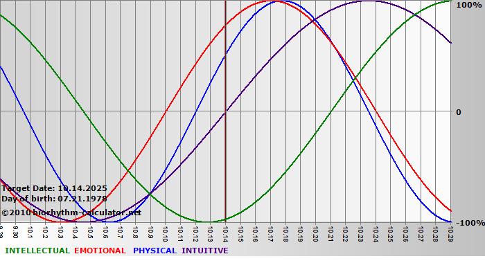 Your biorhythm above the horizontal line indicates that your capacity in that area is enhanced; you feel stronger, more alert, more connected, more empathetic. These are times when you are able to do more, be more, enjoy more. When the biorhythm lines are below 0%, your capacity is diminished, and conservative behavior is recommended.