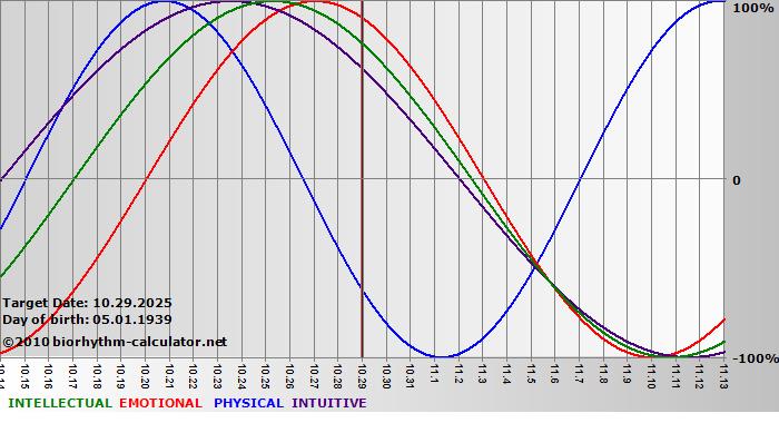 Your biorhythm above the horizontal line indicates that your capacity in that area is enhanced; you feel stronger, more alert, more connected, more empathetic. These are times when you are able to do more, be more, enjoy more. When the biorhythm lines are below 0%, your capacity is diminished, and conservative behavior is recommended.