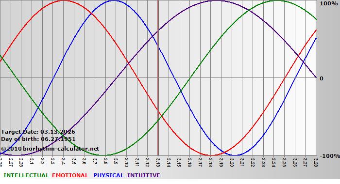 Your biorhythm above the horizontal line indicates that your capacity in that area is enhanced; you feel stronger, more alert, more connected, more empathetic. These are times when you are able to do more, be more, enjoy more. When the biorhythm lines are below 0%, your capacity is diminished, and conservative behavior is recommended.