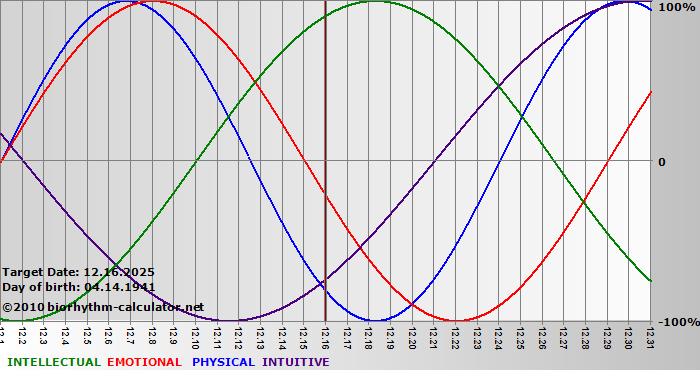 Your biorhythm above the horizontal line indicates that your capacity in that area is enhanced; you feel stronger, more alert, more connected, more empathetic. These are times when you are able to do more, be more, enjoy more. When the biorhythm lines are below 0%, your capacity is diminished, and conservative behavior is recommended.