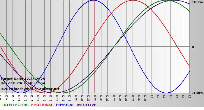 Your biorhythm above the horizontal line indicates that your capacity in that area is enhanced; you feel stronger, more alert, more connected, more empathetic. These are times when you are able to do more, be more, enjoy more. When the biorhythm lines are below 0%, your capacity is diminished, and conservative behavior is recommended.