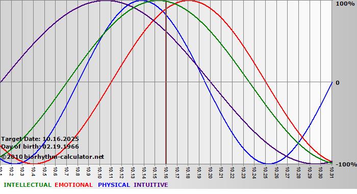 Your biorhythm above the horizontal line indicates that your capacity in that area is enhanced; you feel stronger, more alert, more connected, more empathetic. These are times when you are able to do more, be more, enjoy more. When the biorhythm lines are below 0%, your capacity is diminished, and conservative behavior is recommended.