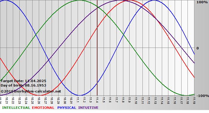 Your biorhythm above the horizontal line indicates that your capacity in that area is enhanced; you feel stronger, more alert, more connected, more empathetic. These are times when you are able to do more, be more, enjoy more. When the biorhythm lines are below 0%, your capacity is diminished, and conservative behavior is recommended.