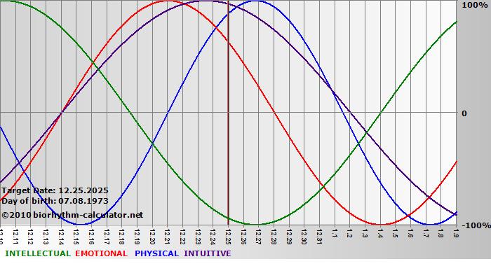 Your biorhythm above the horizontal line indicates that your capacity in that area is enhanced; you feel stronger, more alert, more connected, more empathetic. These are times when you are able to do more, be more, enjoy more. When the biorhythm lines are below 0%, your capacity is diminished, and conservative behavior is recommended.