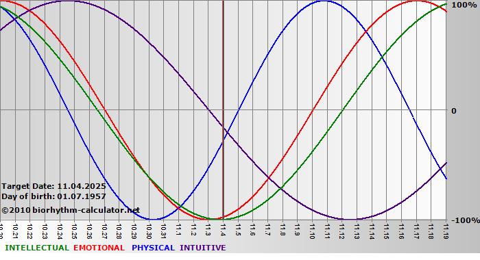 Your biorhythm above the horizontal line indicates that your capacity in that area is enhanced; you feel stronger, more alert, more connected, more empathetic. These are times when you are able to do more, be more, enjoy more. When the biorhythm lines are below 0%, your capacity is diminished, and conservative behavior is recommended.