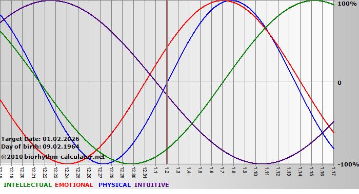 Your biorhythm above the horizontal line indicates that your capacity in that area is enhanced; you feel stronger, more alert, more connected, more empathetic. These are times when you are able to do more, be more, enjoy more. When the biorhythm lines are below 0%, your capacity is diminished, and conservative behavior is recommended.