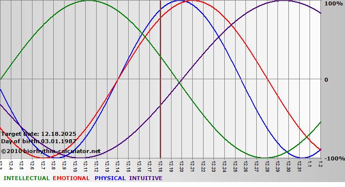 Your biorhythm above the horizontal line indicates that your capacity in that area is enhanced; you feel stronger, more alert, more connected, more empathetic. These are times when you are able to do more, be more, enjoy more. When the biorhythm lines are below 0%, your capacity is diminished, and conservative behavior is recommended.