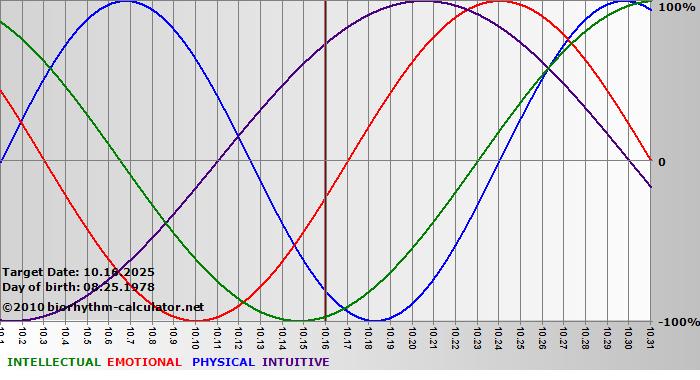 Your biorhythm above the horizontal line indicates that your capacity in that area is enhanced; you feel stronger, more alert, more connected, more empathetic. These are times when you are able to do more, be more, enjoy more. When the biorhythm lines are below 0%, your capacity is diminished, and conservative behavior is recommended.