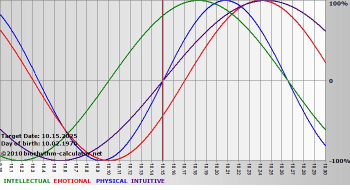 Your biorhythm above the horizontal line indicates that your capacity in that area is enhanced; you feel stronger, more alert, more connected, more empathetic. These are times when you are able to do more, be more, enjoy more. When the biorhythm lines are below 0%, your capacity is diminished, and conservative behavior is recommended.
