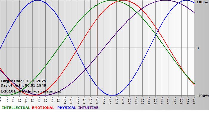 Your biorhythm above the horizontal line indicates that your capacity in that area is enhanced; you feel stronger, more alert, more connected, more empathetic. These are times when you are able to do more, be more, enjoy more. When the biorhythm lines are below 0%, your capacity is diminished, and conservative behavior is recommended.