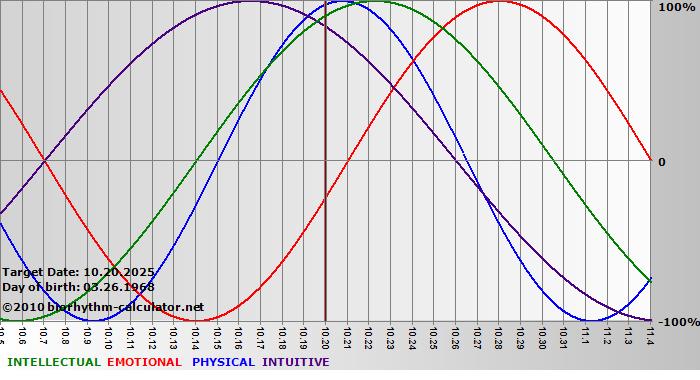 Your biorhythm above the horizontal line indicates that your capacity in that area is enhanced; you feel stronger, more alert, more connected, more empathetic. These are times when you are able to do more, be more, enjoy more. When the biorhythm lines are below 0%, your capacity is diminished, and conservative behavior is recommended.