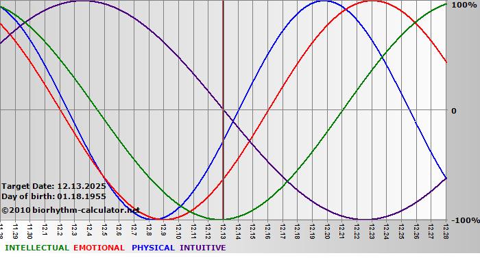 Your biorhythm above the horizontal line indicates that your capacity in that area is enhanced; you feel stronger, more alert, more connected, more empathetic. These are times when you are able to do more, be more, enjoy more. When the biorhythm lines are below 0%, your capacity is diminished, and conservative behavior is recommended.