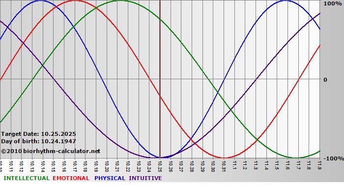 Your biorhythm above the horizontal line indicates that your capacity in that area is enhanced; you feel stronger, more alert, more connected, more empathetic. These are times when you are able to do more, be more, enjoy more. When the biorhythm lines are below 0%, your capacity is diminished, and conservative behavior is recommended.