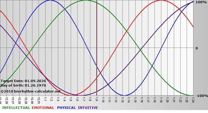 Your biorhythm above the horizontal line indicates that your capacity in that area is enhanced; you feel stronger, more alert, more connected, more empathetic. These are times when you are able to do more, be more, enjoy more. When the biorhythm lines are below 0%, your capacity is diminished, and conservative behavior is recommended.