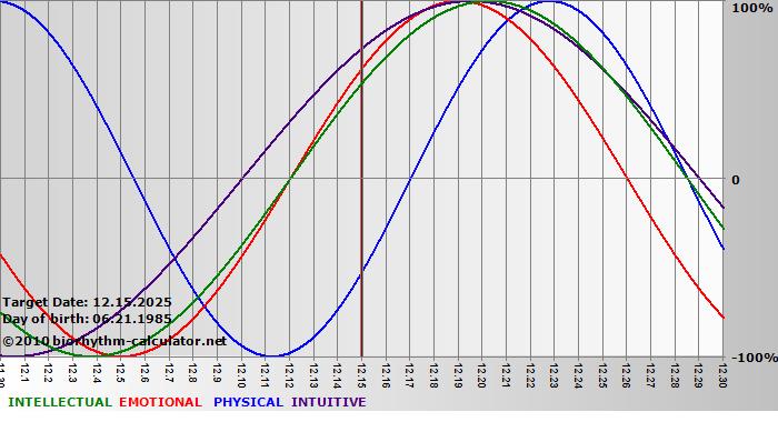 Your biorhythm above the horizontal line indicates that your capacity in that area is enhanced; you feel stronger, more alert, more connected, more empathetic. These are times when you are able to do more, be more, enjoy more. When the biorhythm lines are below 0%, your capacity is diminished, and conservative behavior is recommended.