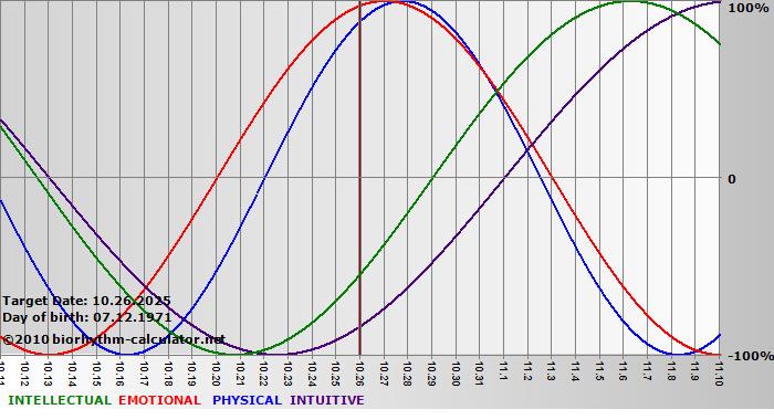 Your biorhythm above the horizontal line indicates that your capacity in that area is enhanced; you feel stronger, more alert, more connected, more empathetic. These are times when you are able to do more, be more, enjoy more. When the biorhythm lines are below 0%, your capacity is diminished, and conservative behavior is recommended.