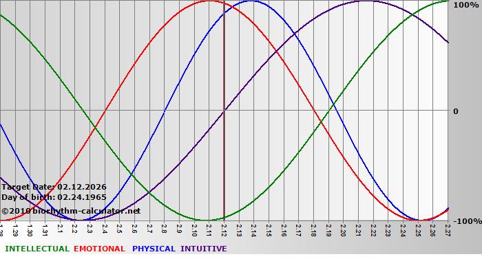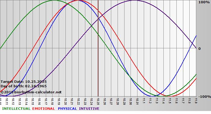Your biorhythm above the horizontal line indicates that your capacity in that area is enhanced; you feel stronger, more alert, more connected, more empathetic. These are times when you are able to do more, be more, enjoy more. When the biorhythm lines are below 0%, your capacity is diminished, and conservative behavior is recommended.