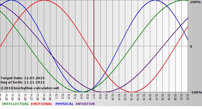 Your biorhythm above the horizontal line indicates that your capacity in that area is enhanced; you feel stronger, more alert, more connected, more empathetic. These are times when you are able to do more, be more, enjoy more. When the biorhythm lines are below 0%, your capacity is diminished, and conservative behavior is recommended.