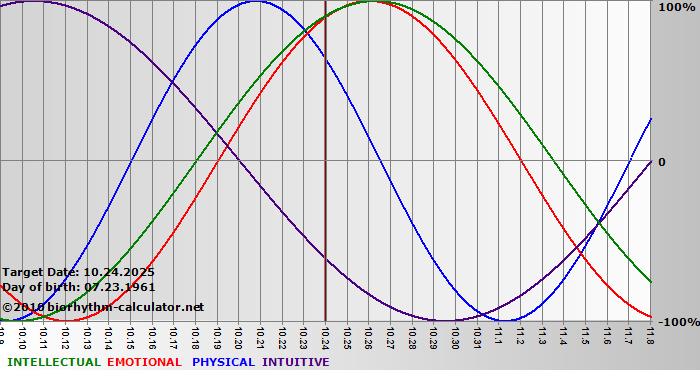 Your biorhythm above the horizontal line indicates that your capacity in that area is enhanced; you feel stronger, more alert, more connected, more empathetic. These are times when you are able to do more, be more, enjoy more. When the biorhythm lines are below 0%, your capacity is diminished, and conservative behavior is recommended.
