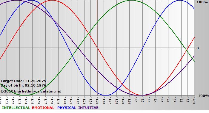 Your biorhythm above the horizontal line indicates that your capacity in that area is enhanced; you feel stronger, more alert, more connected, more empathetic. These are times when you are able to do more, be more, enjoy more. When the biorhythm lines are below 0%, your capacity is diminished, and conservative behavior is recommended.
