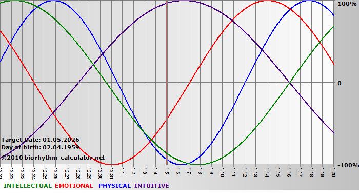 Your biorhythm above the horizontal line indicates that your capacity in that area is enhanced; you feel stronger, more alert, more connected, more empathetic. These are times when you are able to do more, be more, enjoy more. When the biorhythm lines are below 0%, your capacity is diminished, and conservative behavior is recommended.