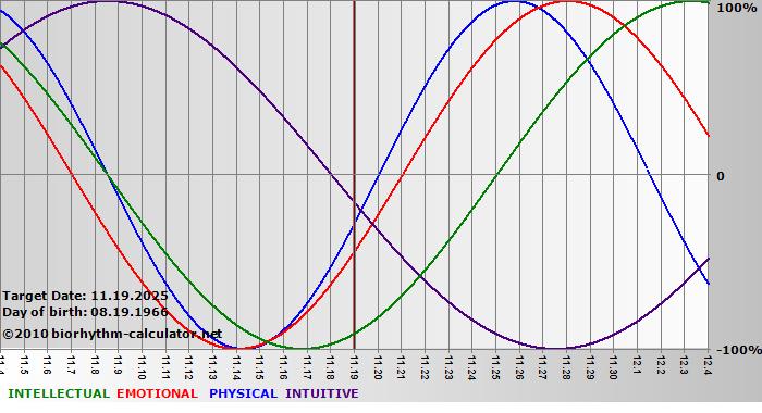 Your biorhythm above the horizontal line indicates that your capacity in that area is enhanced; you feel stronger, more alert, more connected, more empathetic. These are times when you are able to do more, be more, enjoy more. When the biorhythm lines are below 0%, your capacity is diminished, and conservative behavior is recommended.