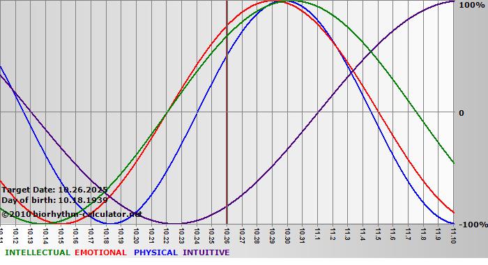 Your biorhythm above the horizontal line indicates that your capacity in that area is enhanced; you feel stronger, more alert, more connected, more empathetic. These are times when you are able to do more, be more, enjoy more. When the biorhythm lines are below 0%, your capacity is diminished, and conservative behavior is recommended.