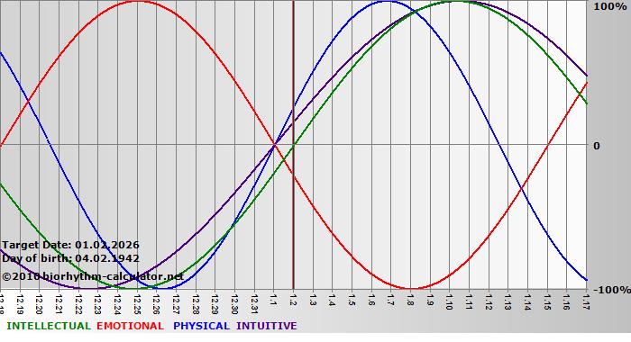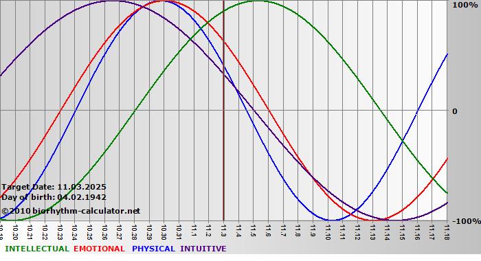 Your biorhythm above the horizontal line indicates that your capacity in that area is enhanced; you feel stronger, more alert, more connected, more empathetic. These are times when you are able to do more, be more, enjoy more. When the biorhythm lines are below 0%, your capacity is diminished, and conservative behavior is recommended.
