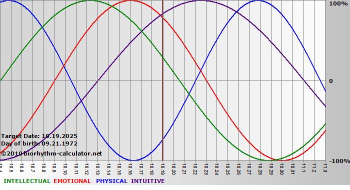 Your biorhythm above the horizontal line indicates that your capacity in that area is enhanced; you feel stronger, more alert, more connected, more empathetic. These are times when you are able to do more, be more, enjoy more. When the biorhythm lines are below 0%, your capacity is diminished, and conservative behavior is recommended.