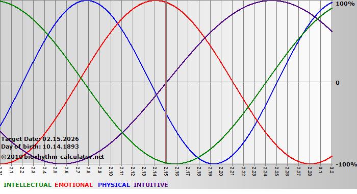 Your biorhythm above the horizontal line indicates that your capacity in that area is enhanced; you feel stronger, more alert, more connected, more empathetic. These are times when you are able to do more, be more, enjoy more. When the biorhythm lines are below 0%, your capacity is diminished, and conservative behavior is recommended.