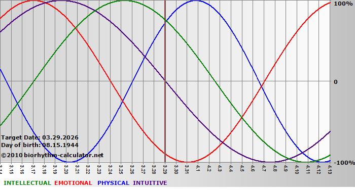 Your biorhythm above the horizontal line indicates that your capacity in that area is enhanced; you feel stronger, more alert, more connected, more empathetic. These are times when you are able to do more, be more, enjoy more. When the biorhythm lines are below 0%, your capacity is diminished, and conservative behavior is recommended.