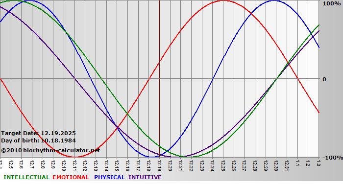 Your biorhythm above the horizontal line indicates that your capacity in that area is enhanced; you feel stronger, more alert, more connected, more empathetic. These are times when you are able to do more, be more, enjoy more. When the biorhythm lines are below 0%, your capacity is diminished, and conservative behavior is recommended.