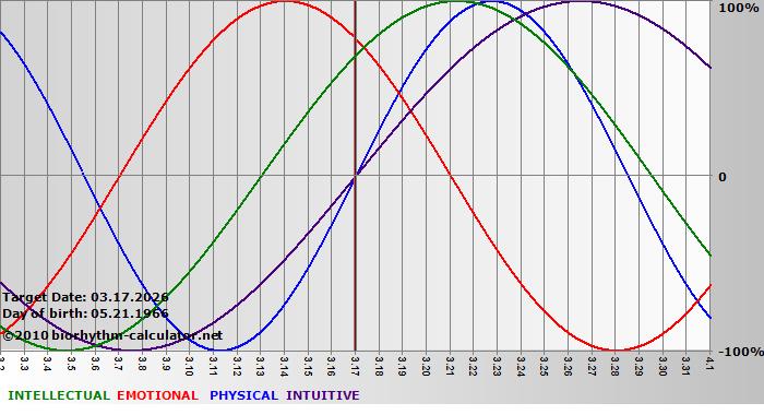 Your biorhythm above the horizontal line indicates that your capacity in that area is enhanced; you feel stronger, more alert, more connected, more empathetic. These are times when you are able to do more, be more, enjoy more. When the biorhythm lines are below 0%, your capacity is diminished, and conservative behavior is recommended.