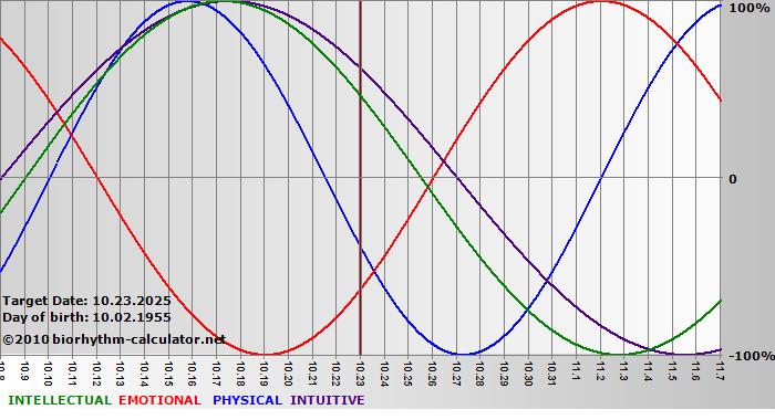Your biorhythm above the horizontal line indicates that your capacity in that area is enhanced; you feel stronger, more alert, more connected, more empathetic. These are times when you are able to do more, be more, enjoy more. When the biorhythm lines are below 0%, your capacity is diminished, and conservative behavior is recommended.