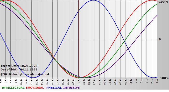 Your biorhythm above the horizontal line indicates that your capacity in that area is enhanced; you feel stronger, more alert, more connected, more empathetic. These are times when you are able to do more, be more, enjoy more. When the biorhythm lines are below 0%, your capacity is diminished, and conservative behavior is recommended.