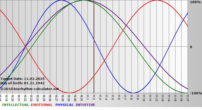 Your biorhythm above the horizontal line indicates that your capacity in that area is enhanced; you feel stronger, more alert, more connected, more empathetic. These are times when you are able to do more, be more, enjoy more. When the biorhythm lines are below 0%, your capacity is diminished, and conservative behavior is recommended.