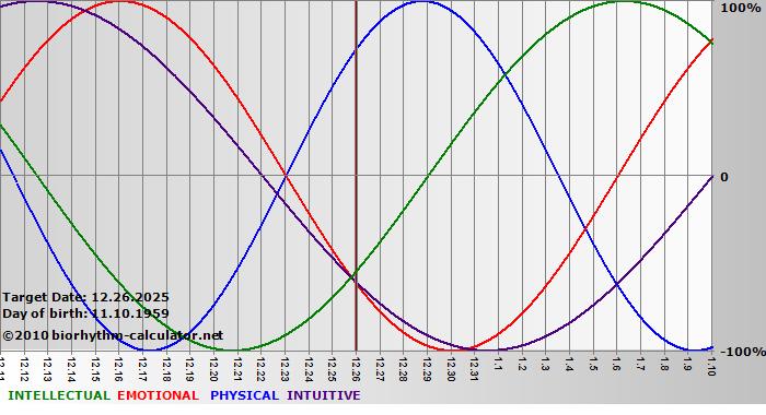 Your biorhythm above the horizontal line indicates that your capacity in that area is enhanced; you feel stronger, more alert, more connected, more empathetic. These are times when you are able to do more, be more, enjoy more. When the biorhythm lines are below 0%, your capacity is diminished, and conservative behavior is recommended.
