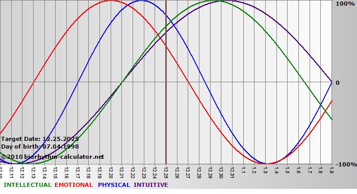 Your biorhythm above the horizontal line indicates that your capacity in that area is enhanced; you feel stronger, more alert, more connected, more empathetic. These are times when you are able to do more, be more, enjoy more. When the biorhythm lines are below 0%, your capacity is diminished, and conservative behavior is recommended.