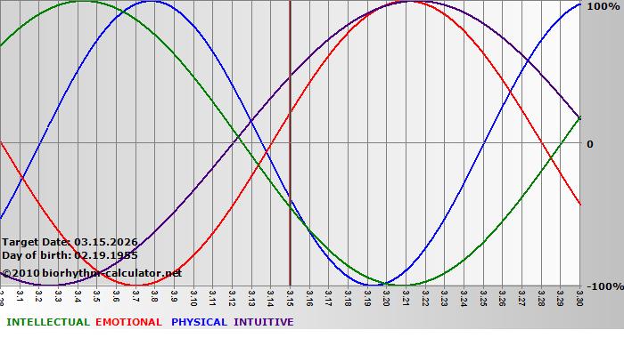 Your biorhythm above the horizontal line indicates that your capacity in that area is enhanced; you feel stronger, more alert, more connected, more empathetic. These are times when you are able to do more, be more, enjoy more. When the biorhythm lines are below 0%, your capacity is diminished, and conservative behavior is recommended.