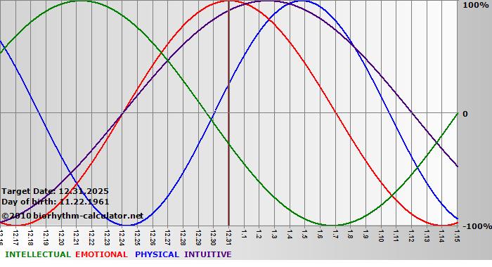 Your biorhythm above the horizontal line indicates that your capacity in that area is enhanced; you feel stronger, more alert, more connected, more empathetic. These are times when you are able to do more, be more, enjoy more. When the biorhythm lines are below 0%, your capacity is diminished, and conservative behavior is recommended.