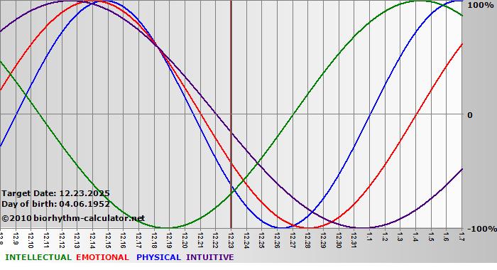 Your biorhythm above the horizontal line indicates that your capacity in that area is enhanced; you feel stronger, more alert, more connected, more empathetic. These are times when you are able to do more, be more, enjoy more. When the biorhythm lines are below 0%, your capacity is diminished, and conservative behavior is recommended.