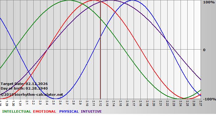 Your biorhythm above the horizontal line indicates that your capacity in that area is enhanced; you feel stronger, more alert, more connected, more empathetic. These are times when you are able to do more, be more, enjoy more. When the biorhythm lines are below 0%, your capacity is diminished, and conservative behavior is recommended.