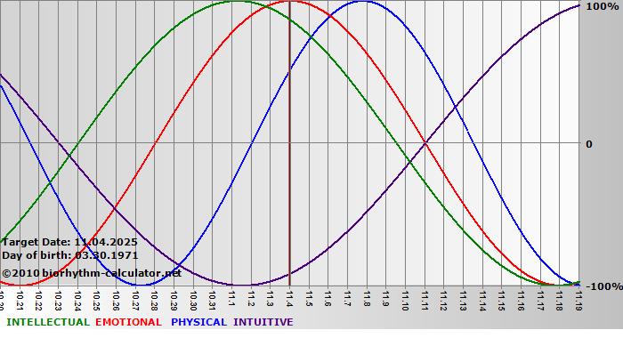 Your biorhythm above the horizontal line indicates that your capacity in that area is enhanced; you feel stronger, more alert, more connected, more empathetic. These are times when you are able to do more, be more, enjoy more. When the biorhythm lines are below 0%, your capacity is diminished, and conservative behavior is recommended.
