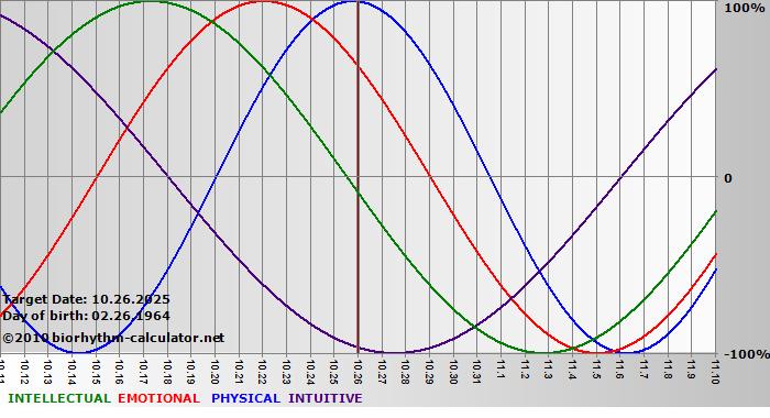 Your biorhythm above the horizontal line indicates that your capacity in that area is enhanced; you feel stronger, more alert, more connected, more empathetic. These are times when you are able to do more, be more, enjoy more. When the biorhythm lines are below 0%, your capacity is diminished, and conservative behavior is recommended.