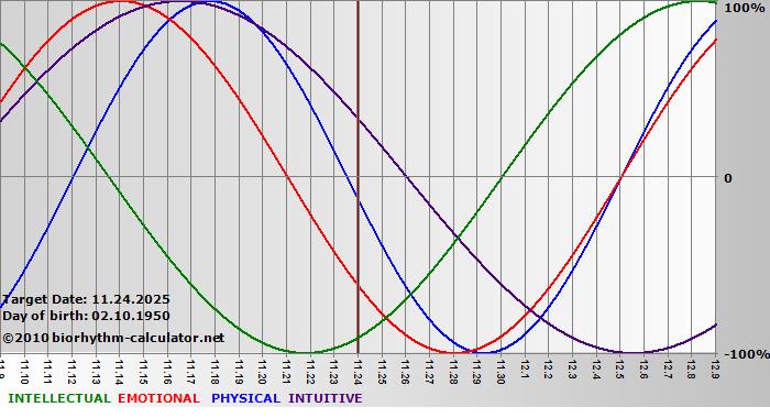 Your biorhythm above the horizontal line indicates that your capacity in that area is enhanced; you feel stronger, more alert, more connected, more empathetic. These are times when you are able to do more, be more, enjoy more. When the biorhythm lines are below 0%, your capacity is diminished, and conservative behavior is recommended.