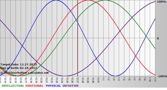 Your biorhythm above the horizontal line indicates that your capacity in that area is enhanced; you feel stronger, more alert, more connected, more empathetic. These are times when you are able to do more, be more, enjoy more. When the biorhythm lines are below 0%, your capacity is diminished, and conservative behavior is recommended.
