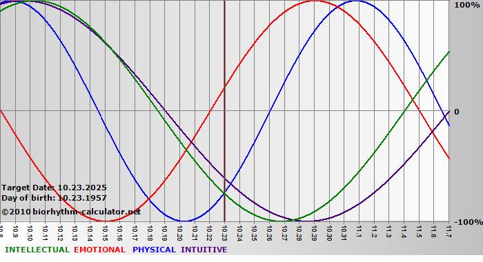 Your biorhythm above the horizontal line indicates that your capacity in that area is enhanced; you feel stronger, more alert, more connected, more empathetic. These are times when you are able to do more, be more, enjoy more. When the biorhythm lines are below 0%, your capacity is diminished, and conservative behavior is recommended.