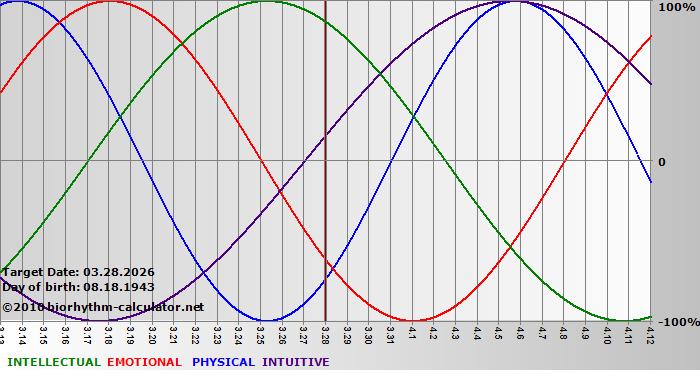 Your biorhythm above the horizontal line indicates that your capacity in that area is enhanced; you feel stronger, more alert, more connected, more empathetic. These are times when you are able to do more, be more, enjoy more. When the biorhythm lines are below 0%, your capacity is diminished, and conservative behavior is recommended.