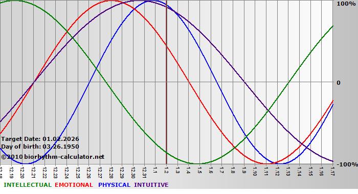 Your biorhythm above the horizontal line indicates that your capacity in that area is enhanced; you feel stronger, more alert, more connected, more empathetic. These are times when you are able to do more, be more, enjoy more. When the biorhythm lines are below 0%, your capacity is diminished, and conservative behavior is recommended.