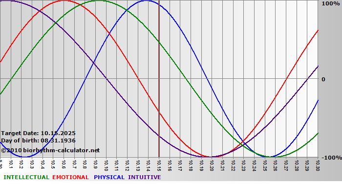 Your biorhythm above the horizontal line indicates that your capacity in that area is enhanced; you feel stronger, more alert, more connected, more empathetic. These are times when you are able to do more, be more, enjoy more. When the biorhythm lines are below 0%, your capacity is diminished, and conservative behavior is recommended.